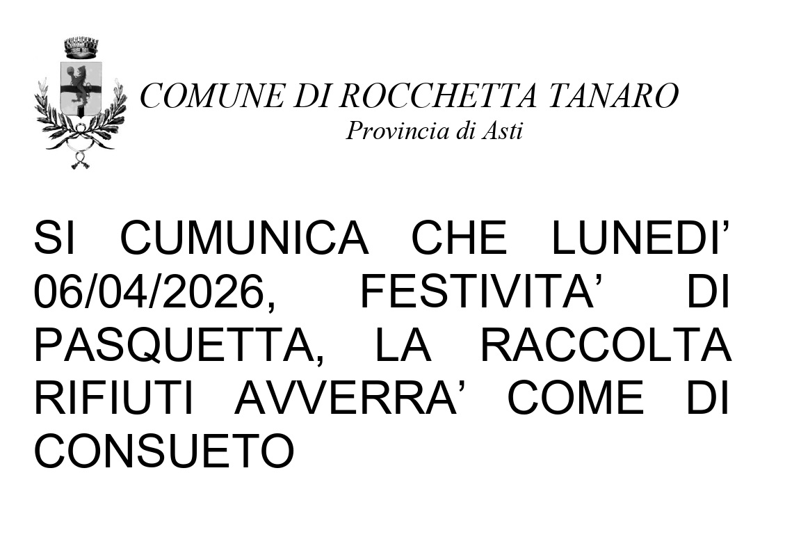 SI COMUNICA CHE LUNEDI' 06/04/2026, FESTIVITA' DI PASQUETTA, LA RACCOLTA RIFIUTI AVVERRA' COME DI CONSUETO